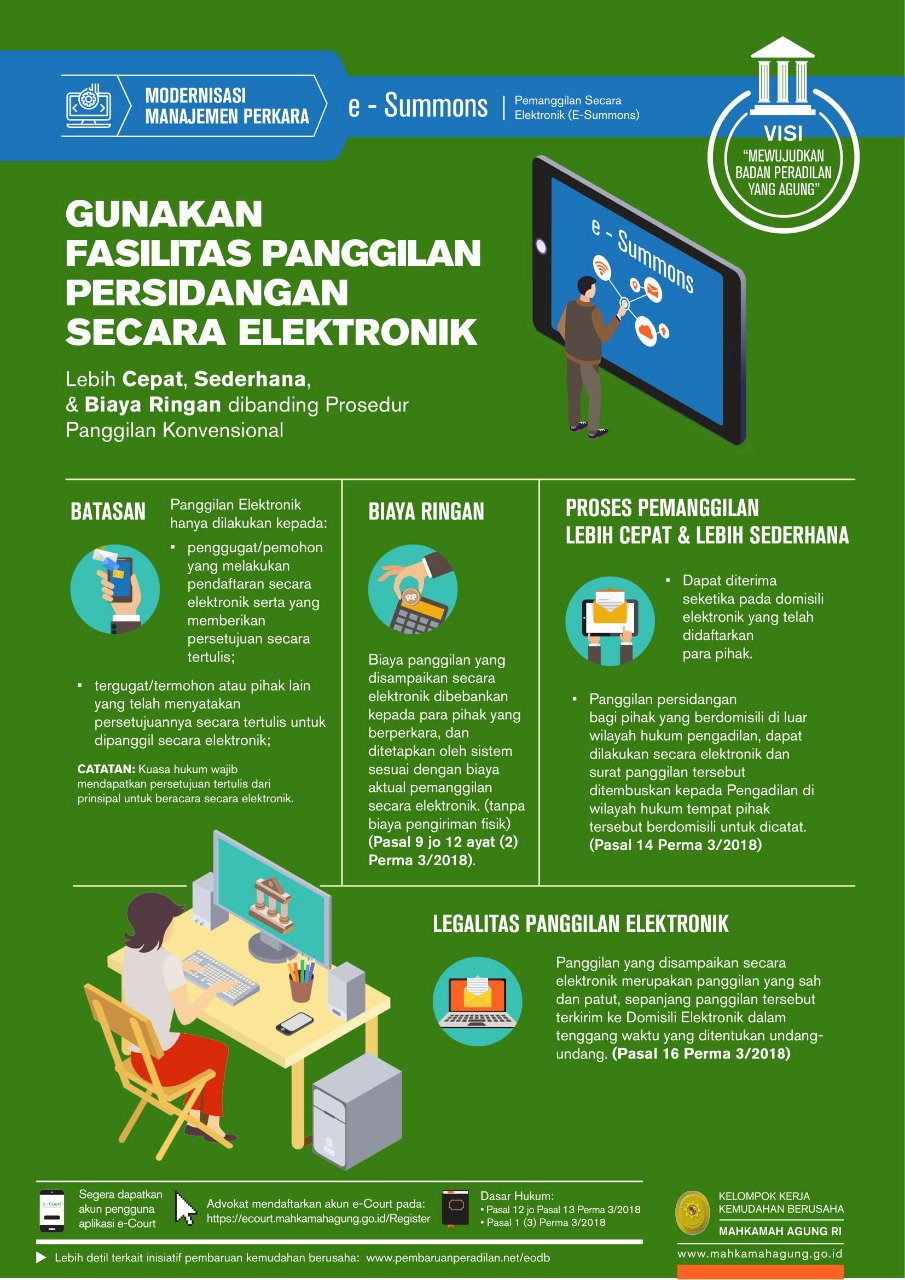 Adalah layanan bagi Pengguna Terdaftar untuk Pendaftaran Perkara Secara Online, Mendapatkan Taksiran Panjar Biaya Perkara secara online, Pembayaran secara online, Pemanggilan yang dilakukan dengan saluran elektronik, dan Persidangan yang dilakukan secara Elektronik.